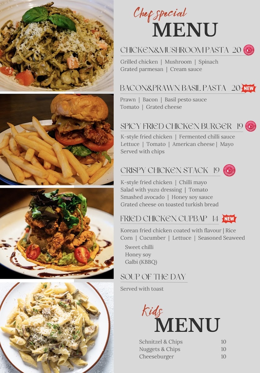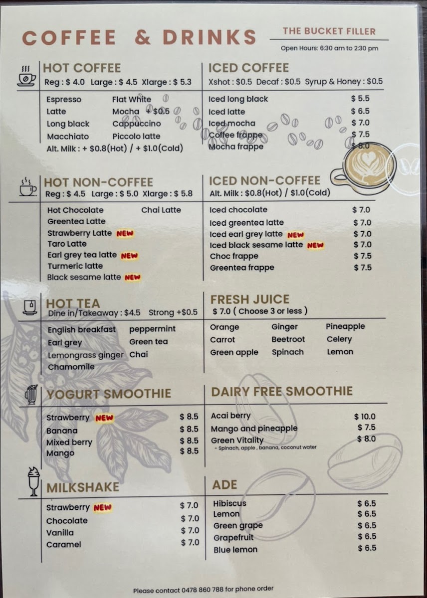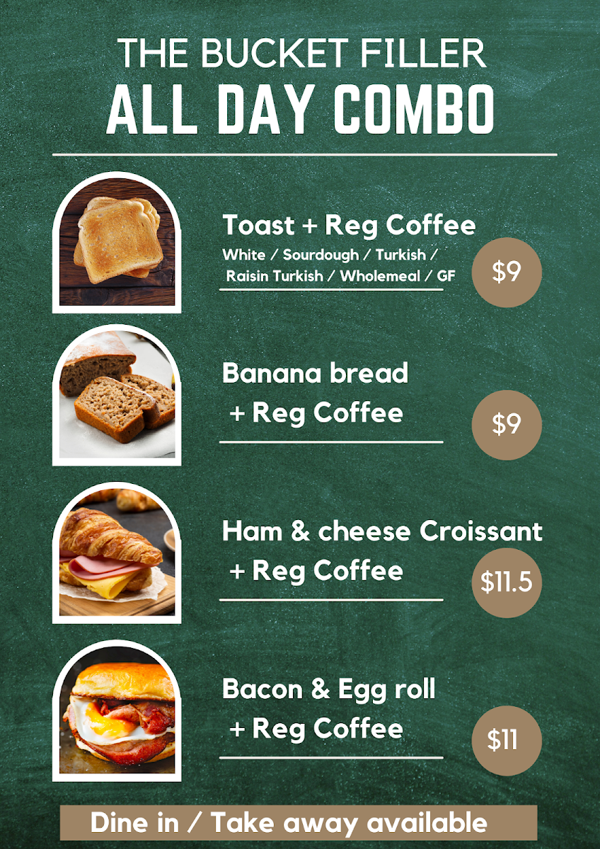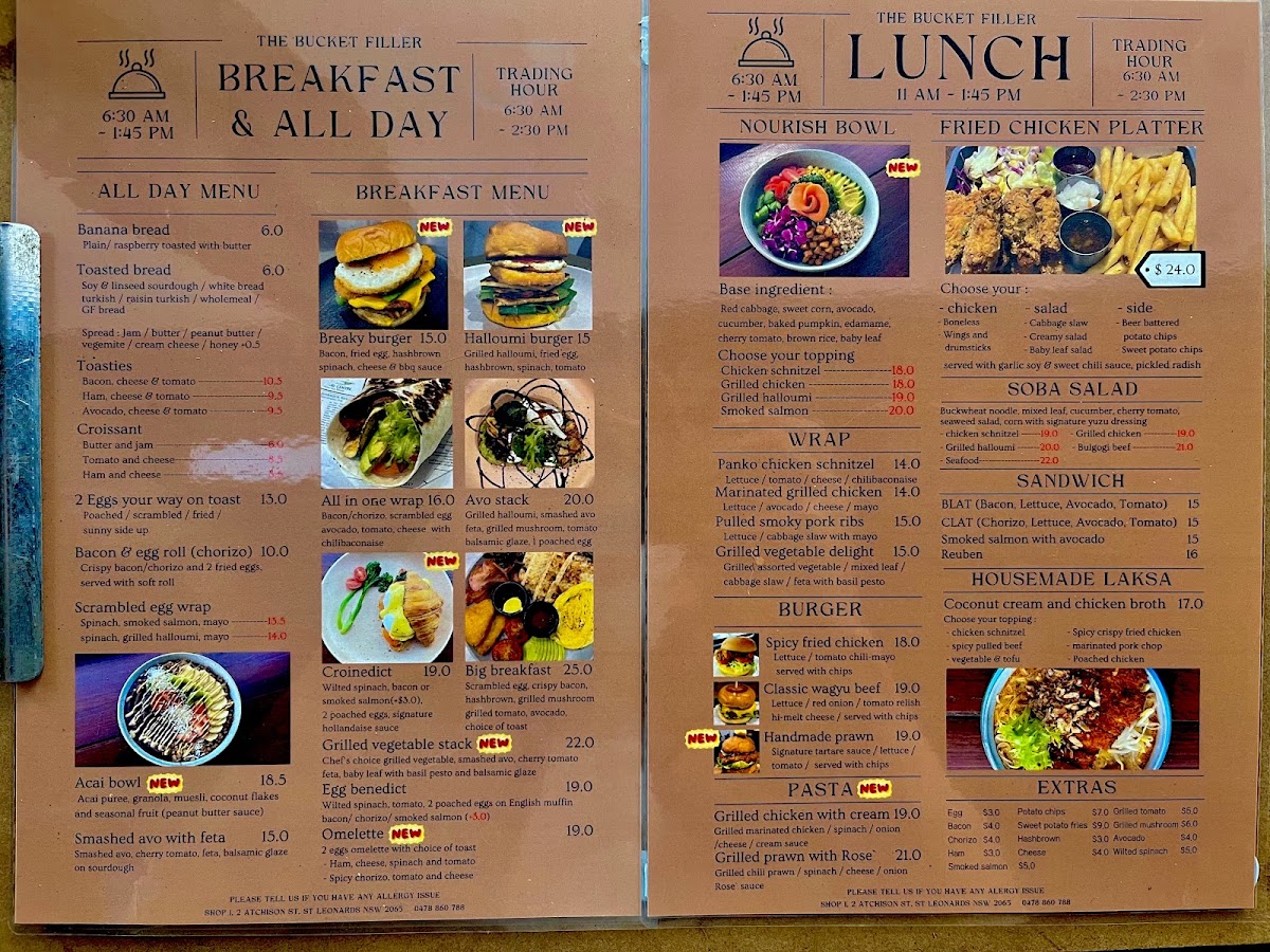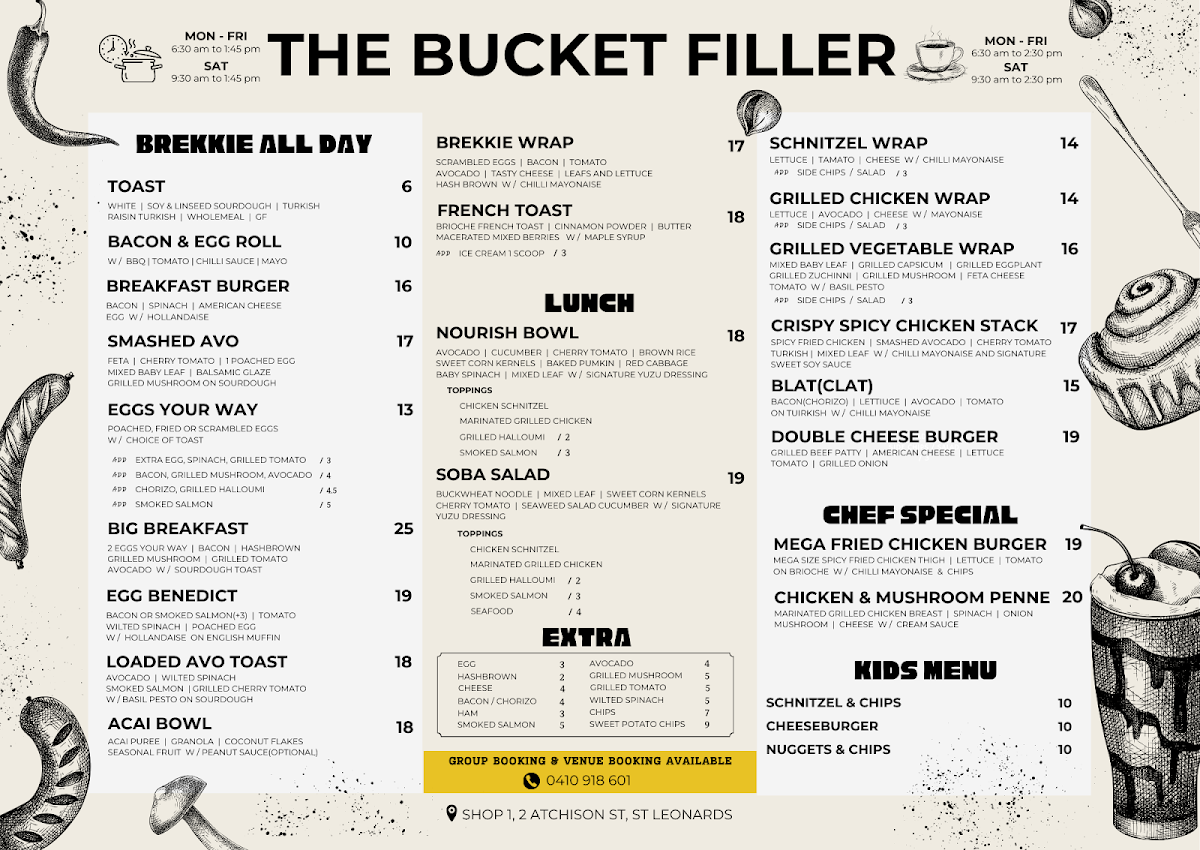 Introducing the menu at The Bucket Filler, a delightful café nestled in St Leonards, Australia, where every meal is crafted to perfection. The breakfast offerings are nothing short of a feast, featuring classics like the Big Breakfast (A$25) and Eggs Your Way (A$13), served all day. Savor the heartiness of the Mega Fried Chicken Burger (A$19) or indulge in a comforting bowl of Chicken & Mushroom Penne (A$20), both chef specials that stand out. Kids will love the simple yet delicious options like Schnitzel & Chips and Cheeseburger (A$10 each).